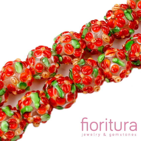 RĘCZNIE ROBIONE KORALIKI SZKLANE LAMPWORK KWIATY KULA NIEREGULARNA 12-13x11-12MM KOLOR ORANGE RED